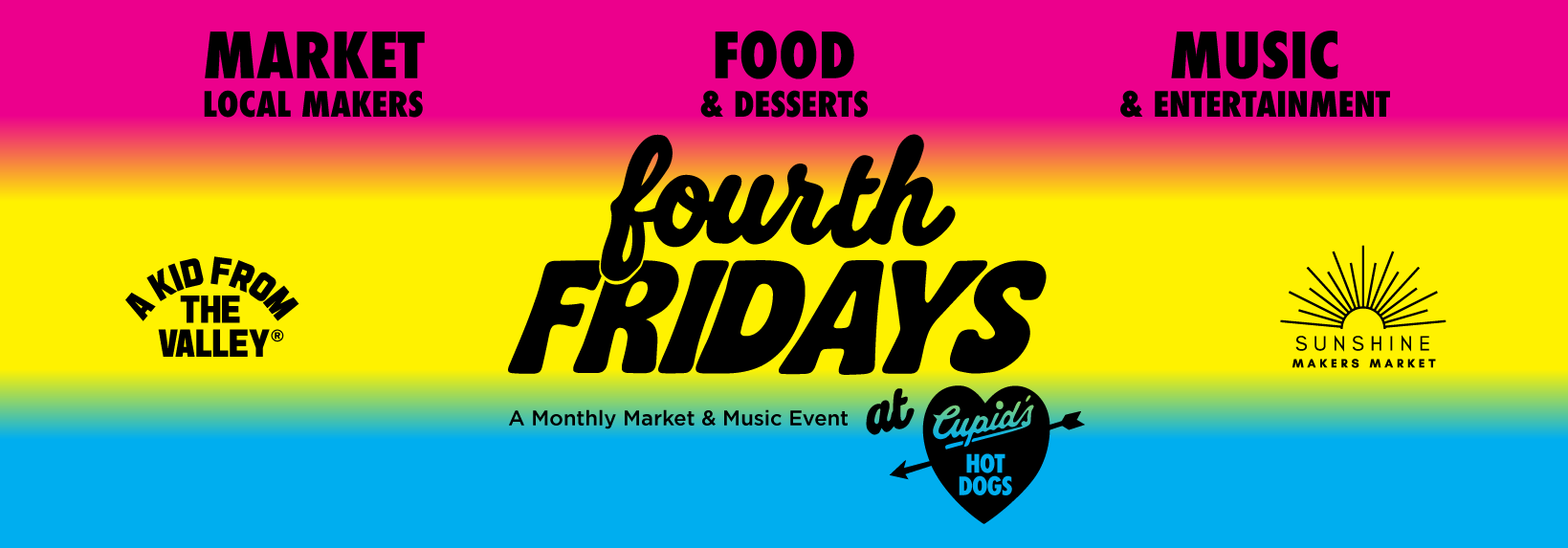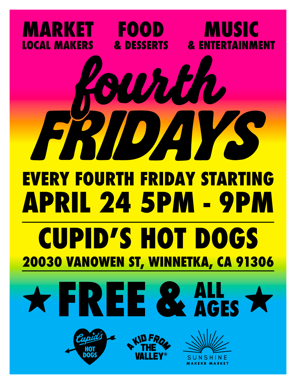 Fourth Fridays is a free, monthly outdoor celebration of Valley culture, community, and creativity, held every fourth Friday of the month in the heart of Winnetka at the iconic Cupid's Hot Dogs. Families, neighbors, makers, and music lovers gather for an evening of live DJ sets or local bands, a curated makers market, kids activities, and the legendary food that has made Cupid's a Valley institution since 1946. This is the neighborhood block party the Valley has been waiting for, free to attend, local at its core, and growing every month.